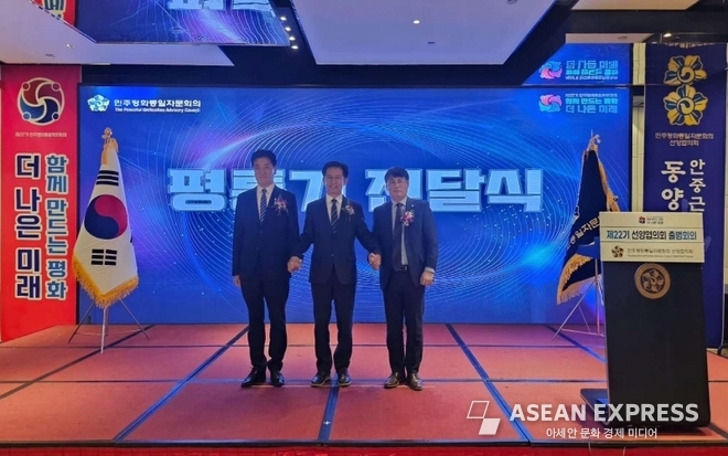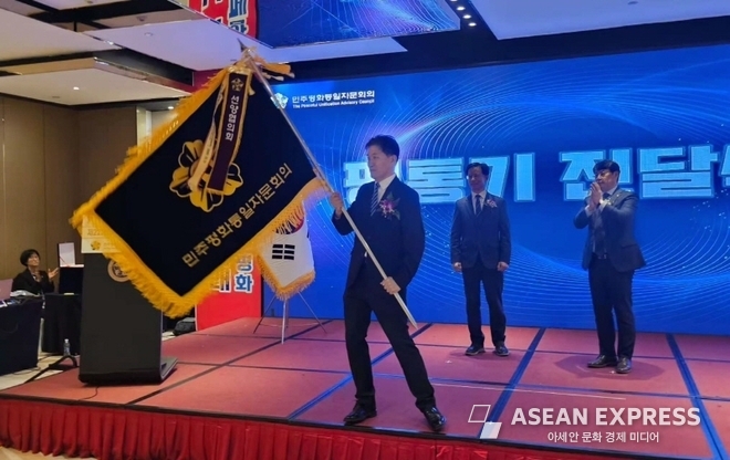 다음은 전임회장인 안성규 회장의 이임사와 함께 평통기 전달순서를 진행했다. 방용승 사무처장은 안성규 전임회장으로부터 민주평통 선양협의회 깃발을 받으며 그간의 노고를 치하했다.