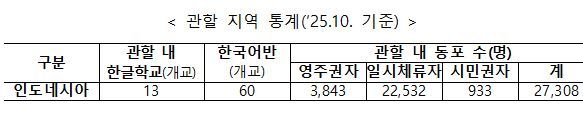 세계 인구 4위(약 2억 7000만 명)의 인도네시아에는 2만 7,300여 명의 재외동포가 거주하고 있다. 최근 한류 열풍에 힘입어 한국에 대한 인도네시아인들의 관심이 매우 높은 편이다. 국내 대학의 인도네시아 유학생도 2,400여 명이다.