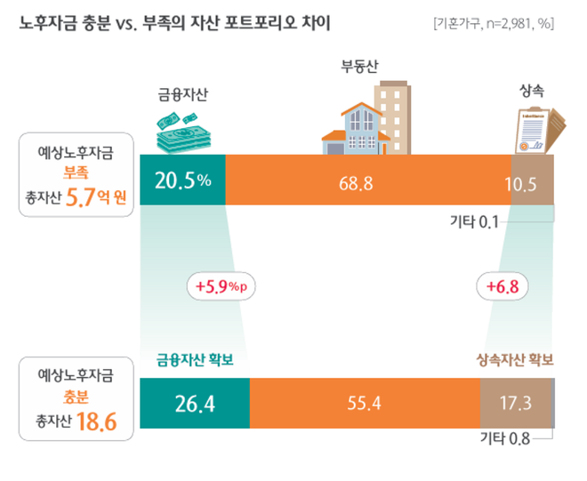 자산 구성에서도 차이를 보였다. 노후자금이 충분한 경우 총자산 중 부동산 비중(55.4%)이 낮았고, 유동자금인 금융자산(26.4%)과 상속자산(17.3%)의 비중은 상대적으로 높았다.