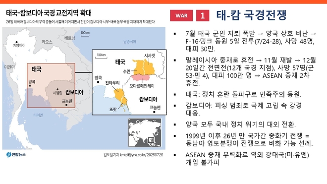 2025년 하반기를 강타한 뉴스는 태국–캄보디아의 국경 전쟁이다. 시작은 국경 지역의 오랜 갈등이었는데, 여기에 캄보디아 훈센의 패통탓 총리와의 통화 녹음이 공개되면서 양국 간 외교 갈등으로 비화했고, 태국과 캄보디아의 국내 정치 상황과 맞물리며 극단적인 무력 충돌로 확대되었다.