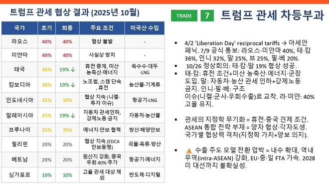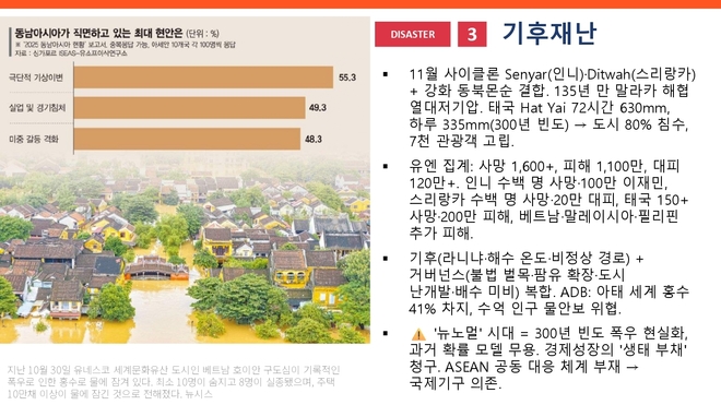 1. 태국-캄보디아 국경분쟁 2. 미얀마 사실상 분할 3. 기후재난 4. 베트남 행정혁명 5. 인도네시아 반특권시위 6. 필리핀 가문내전 7. 트럼프 관세 차등부과 8. 성장률 양극화 9. 데이터 주권-DC붐 10. 티모르-레스테 가입