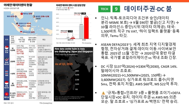 사건이 아닌 경제흐름의 측면에서 뽑으라면 AI·데이터센터 투자 붐과 동시에 강화된 플랫폼 규제다. AWS·구글·MS 등 글로벌 빅테크는 말레이시아·인도네시아·태국·베트남을 거점으로 클라우드와 AI 인프라 투자를 빠르게 늘리고 있고, 각국 정부도 데이터센터 유치를 적극 환영하면서 전략적으로 데이터센터 허브를 지향한다.