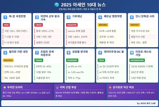 Asia Biz Lab은 격동의 2025년을 돌아보는 ASEAN 10대 뉴스를 선정했다. 카드뉴스로 소개해본다.