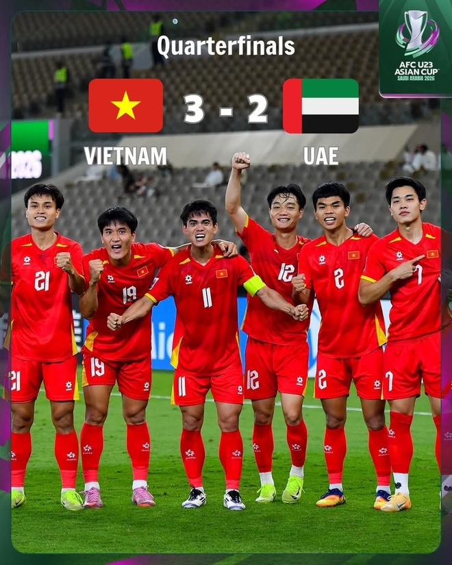 베트남은 17일(한국시간) 사우디아라비아 제다의 프린스 압둘라 알 파이살 스포츠 시티 스타디움에서 열린 아랍에미리트(UAE)와의 2026 아시아축구연맹(AFC) 23세 이하(U-23) 아시안컵 8강전에서 연장 혈투 끝에 3-2 승리하며 4강에 진출했다.