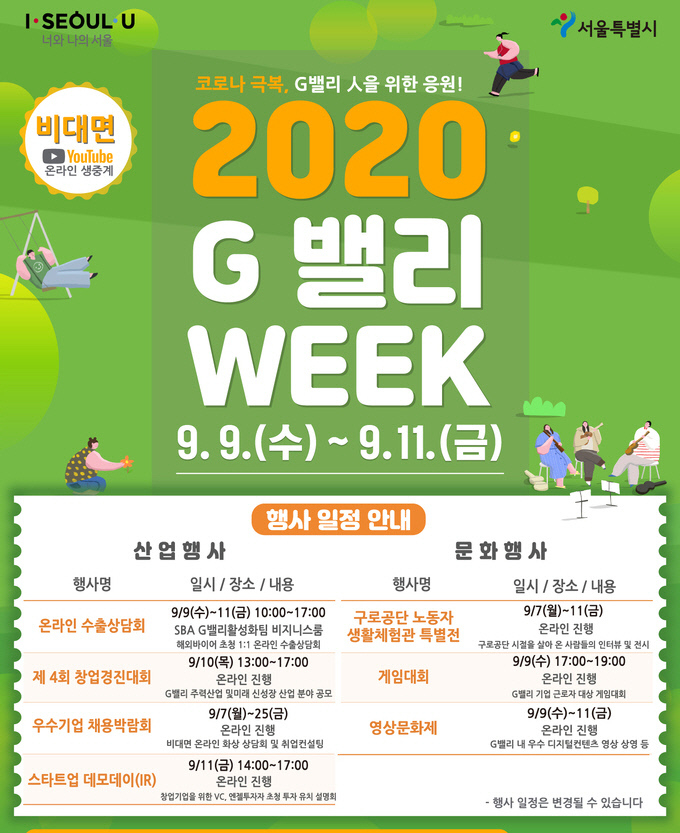 ‘G밸리 비대면 위크’는 산업행사(40개 해외 바이어 참여 수출상담회, 창업경진대회, 50개 기업 온라인 채용박람회, 80개 VC·엔젤투자자 참여 데모데이)와 문화행사(구로공단 노동자생활 체험관 특별전, 게임대회, 영상문화제)로 진행된다.