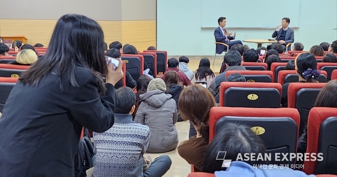 강연장은 그가 등장 이전부터 열기가 달아올랐다. 170명 특강 모집 신청은 조기마감했다고 한다. 현장에서는 대기줄이 점점 늘어나 일부는 돌려보냈다. 추가 입장이 허락된 이들은 좌석 옆 통로에 앉거나 서서 강연을 들었다.