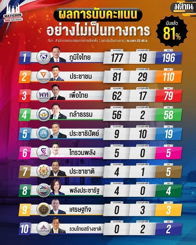한편 지난 8일 치러진 태국 총선에서는 아누틴 찬위라꾼 총리(Anutin Charnvirakul, 60)가 이끈 보수 품짜이타이당(Bhumjaithai Party)이 500석 중 193석을 얻어 대승을 했다.