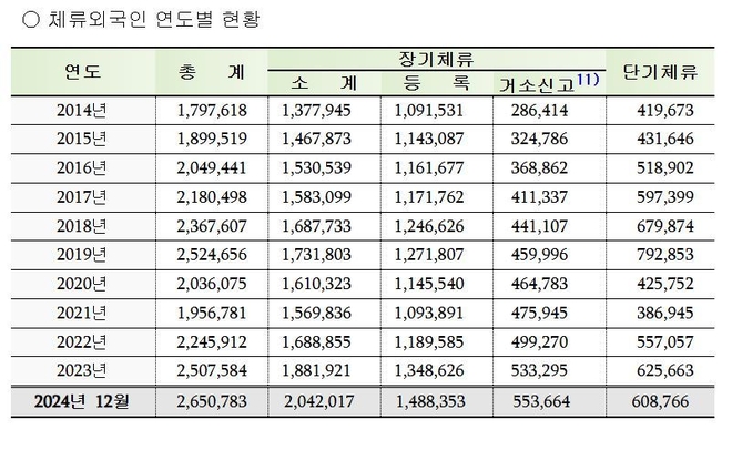 법무부 산하 출입국관리사무소 자료에 따르면, 2024년 말까지 단기 및 장기 체류 외국인 수가 전체 인구의 5.17%에 해당하는 265만 명을 넘어섰다. 2019년에 비해 126,127명 증가한 수치로, 2023년에 기록한 4.89%를 늘어났다.