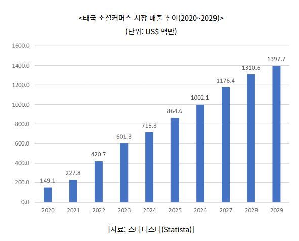 조사기관 스타티스타에 따르면, 태국 전자상거래 시장의 소셜커머스 부문 매출은 2024년 7억1527만 달러에 이를 것으로 추정된다. 2020년부터 2024년까지 매출은 꾸준한 상승세를 보이며, 5억 6619만 달러(약 8,119억 7,307만 9,000 원) 증가했다. 또한, 2024년부터 2029년 사이에는 6억 8241만 달러(약 9,786억 4,418만 1,000 원)가 추가로 증가할 것으로 예상돼, 앞으로도 지속적인 성장세를 이어갈 것으로 전망된다.