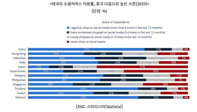 스타티스타 보고서(2025)에 따르면, 태국 소비자의 69%가 최근 1년간 6회 이상 소셜미디어를 통해 정기적으로 쇼핑을 경험한 것으로 나타났다. 가끔 이용(3~6회)한다고 응답한 비율까지 포함하면 전체의 87%가 소셜미디어를 통한 구매 경험이 있는 것으로 조사됐다.
