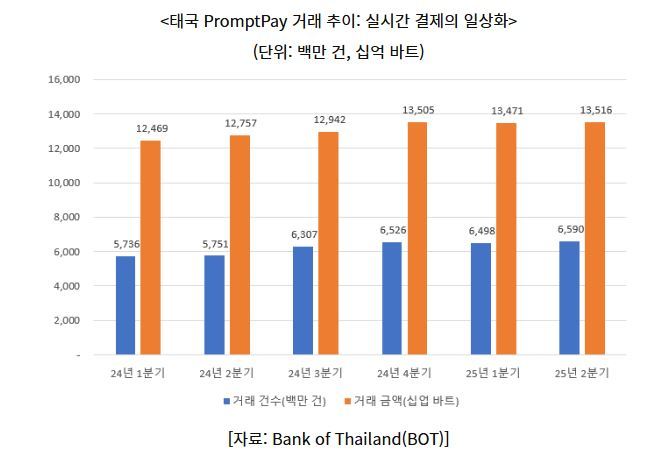태국 중앙은행(BOT)에 따르면, 2025년 2분기 기준 프롬프트페이 거래량은 약 65억9000만 건으로, 일평균 약 7200만 건의 거래량을 보이며, 거래금액은 약 13조5000억 바트(약 4120억 달러)에 달했다. 이는 실시간 이체와 모바일 결제가 태국 전역에서 완전히 일상화됐음을 보여주는 지표다.