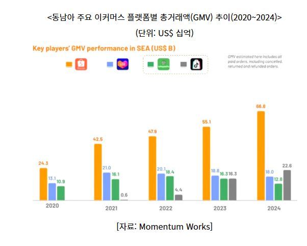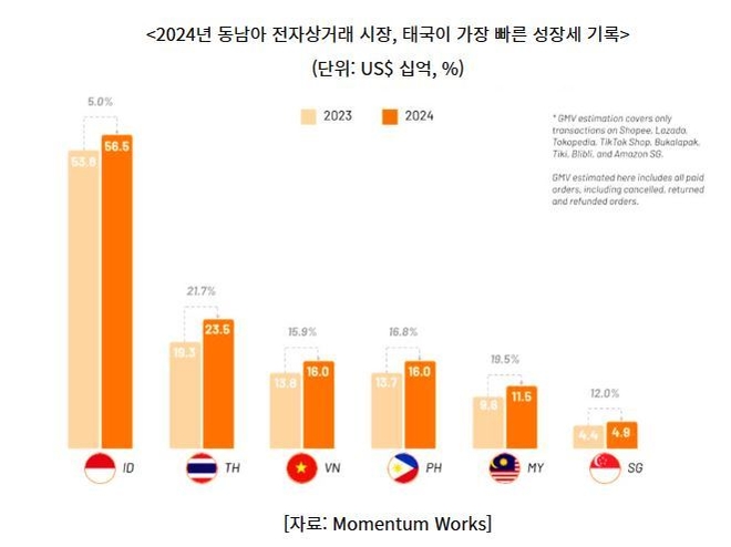 싱가포르 조사기관 모멘텀 웍스(Momentum Works)에 따르면, 2024년 태국의 전자상거래 총거래액(GMV)은 전년(193억 달러) 대비 21.7% 증가한 235억 달러(약 33조 7,178억 원)로, 인도네시아(5%)·베트남(15.9%) 등 주변국을 크게 앞서며 동남아시아에서 가장 빠른 성장세를 기록했다.