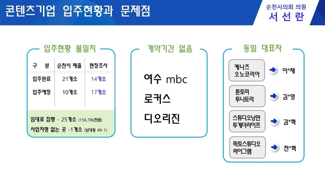 서 의원에 따르면, 순천시는 원도심의 공실을 리모델링해 21곳이 입주 완료됐다고 밝혔지만, 실제 가동 중인 곳은 14곳 안팎에 불과했다. 일부 건물은 1·2층이 모두 비어 있음에도 ‘입주 완료’로 처리됐다. 서 의원은 “1년에 3억 원이 넘는 임대료가 예산에서 지출되고 있다”며 “이런 식이면 시민이 체감하지 못하는 ‘서류 행정’에 그칠 뿐”이라고 비판했다.