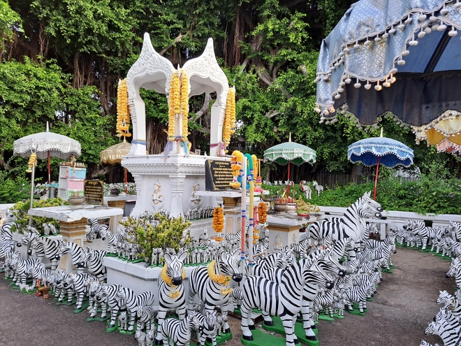 얼룩말의 경우 그 상징성은 보다 현대적인 도시 경험과 맞닿아 있다. 태국에서 횡단보도는 ‘얼룩말 길’이라 불리는데, 이 이미지가 곧 안전과 보호, 무사함을 뜻하는 신앙적 기호로 변용된 것이다. 도로 주변 브라흐마 신상 곁에 줄지어 놓인 얼룩말 조형물은, 현대 교통 체계의 기호가 토속신앙과 만나 재해석되는 장면이라 할 수 있다.