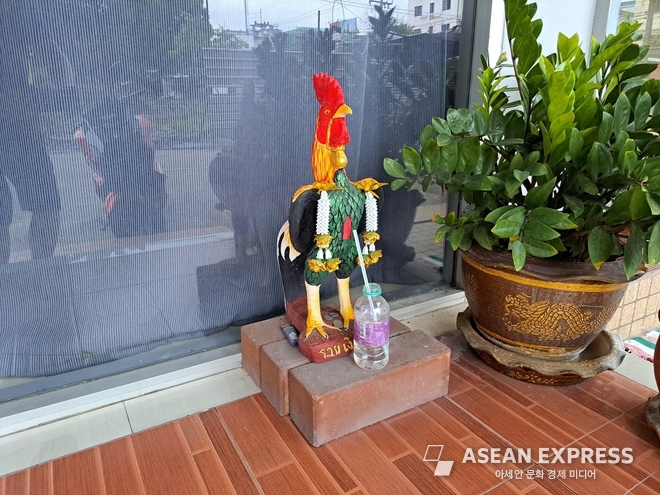 가게 앞에 놓인 닭 조각상과 그 앞에 진열된 음료수 역시 단순한 장식으로 치부하기 어렵다. 태국 사회에서 동물 조형물은 분명한 상징적 효능을 지닌다. 닭은 재물을 불러들이는 동물로 여겨지며, 닭의 부리가 모이를 쪼듯이 돈을 하나하나 찍어 모아 온다는 믿음이 투영되어 있다. 닭의 해에 태어난 사람에게 복을 가져다준다는 인식도 여기에 더해진다.