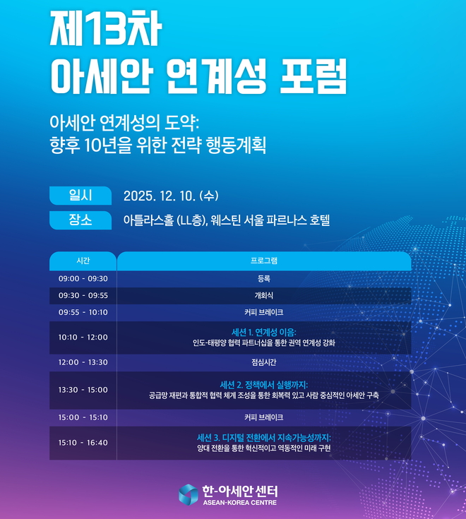 한-아세안센터(사무총장 김재신)는 2025년 12월 10일(수) 웨스틴 서울 파르나스 호텔 아틀라스 홀에서 ‘제13차 아세안 연계성 포럼’을 개최한다.