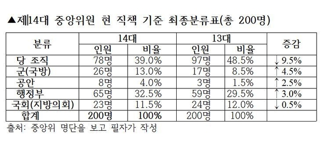 제14대 중앙집행위원회는 당 조직을 중심으로 군과 공안이 이를 떠받치고, 행정부와 국회가 집행과 제도화를 담당하는 권력 구조를 보여준다. 이런 점에서 제13대가 도덕적 정당성 회복의 정치였다면, 제14대는 체제를 관리하며 성장을 최적화하는 정치로 이해할 수 있다.