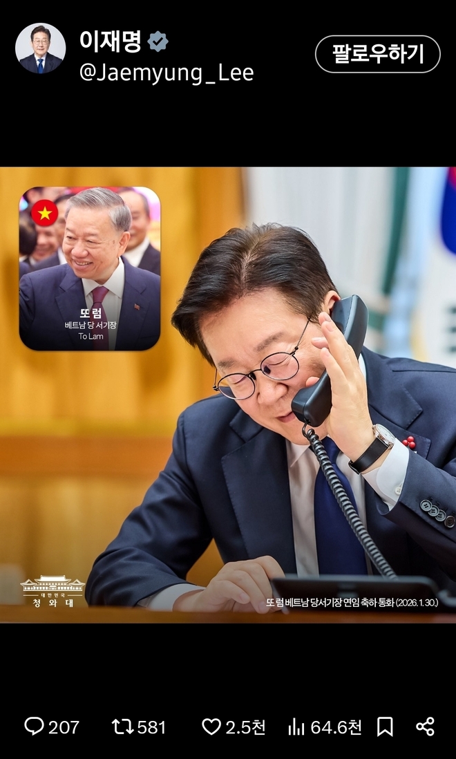 강유정 청와대 대변인은 “이재명 대통령은 베트남 권력 서열 1위로 최근 연임에 성공한 또 럼 공산당 서기장과 30일 통화를 하고 축하를 전했다”고 이 밝힌 바 있다.