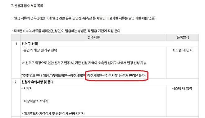 일각에서는 민주당 예비후보 등록을 선관위 예비후보 등록에 준하는 기준을 적용해야 절차적 공정성과 투명성이 확보된다고 말한다. 공직선거법은 예비후보자 등록을 ‘선거구별’로 제한해 직급 변경에 실질적인 제약을 두고 있다. 실제로 민주당 충북도당은 공천 혼선을 막기 위해 ‘청주시의원에서 청주시장 등 선거 변경은 불가하다’는 점을 명시하고 있다.