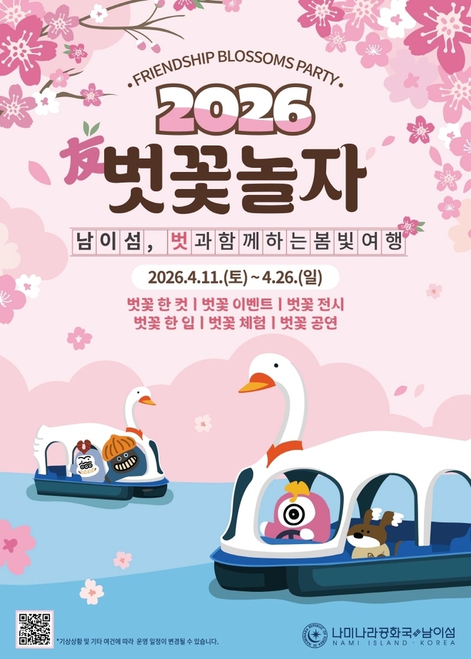 이와 함께 오는 4월 11일부터 26일까지 남이섬 전역에서는 대표 봄 축제 ‘벗(友)꽃놀자’가 개최된다. ‘벗과 함께 즐기는 봄’을 주제로 한 이번 축제는 가족-연인-친구와 함께하는 따뜻한 봄 여행을 제안하며, 다양한 체험과 공연, 전시 콘텐츠로 방문객을 맞이할 예정이다.
